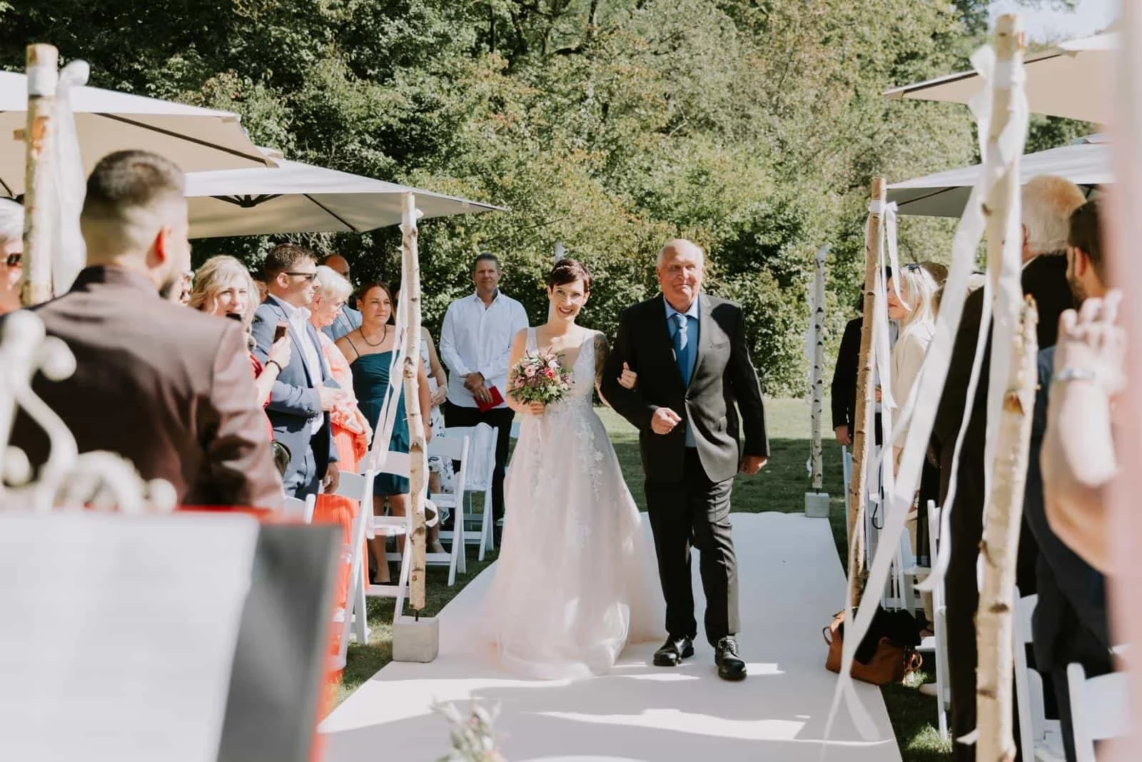 Genießt diesen Moment! Er ist einzigartig. Macht Euch Gedanken, ob die Braut alleine einzieht oder in Begleitung? Wollt Ihr gemeinsam einziehen oder wollt Ihr den Einzug ganz weglassen und es läuft einfach nur zu Beginn der Trauung Euer gemeinsames Lieblingslied?